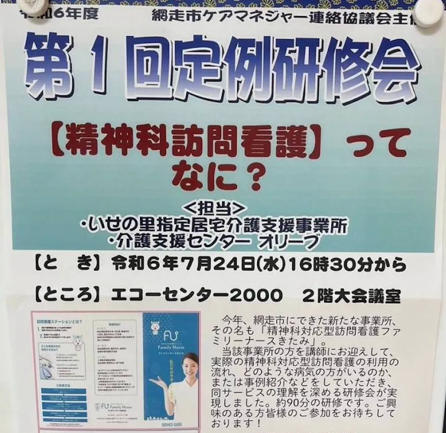 一緒に働く看護師やスタッフ・業務提携先を募集中です。北海道北見市では訪問看護ステーション「ファミリーナースきたみ」((株)カムイメディカルワークスが運営)を運営しています。グループとして、結婚相談所En-countやイベント企画会社を東京で展開しているほか((株)カムイメディカルTOKYOが運営)、訪問看護ステーションでは看護師や理学療法士も求人していますので、訪問看護に興味がある北見市周辺にお住まいの方は募集要項をご覧ください。また業務提携先の「ファミリーナース習志野」でも看護師を募集しておりますので、千葉周辺にお住まいの方はお問い合わせください。いずれの事業も完全週休二日制で残業はほぼなく働きやすい環境です。